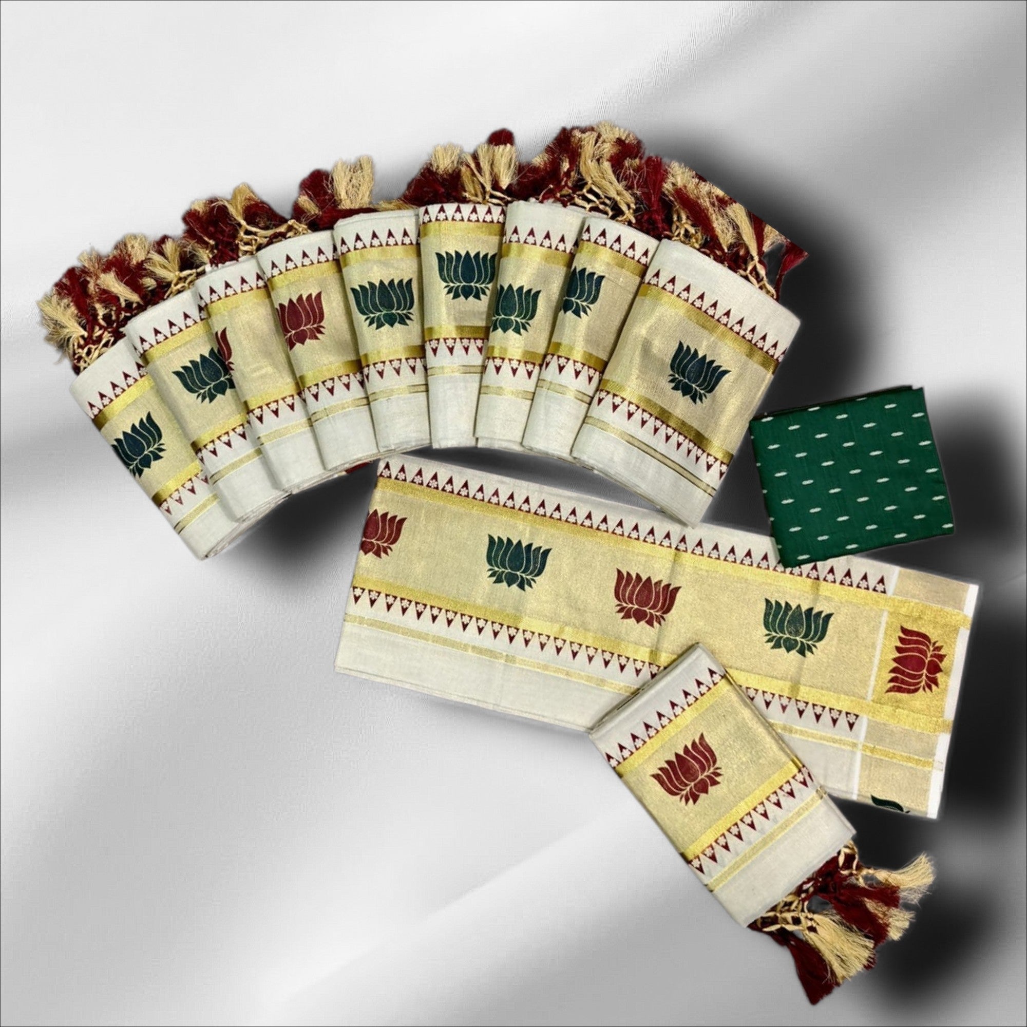 The Tissue Lotus Print Setmundu with Blouse features a delicate lotus print, expertly crafted to enhance elegance. The lightweight tissue fabric ensures breathability and comfort, making it suitable for various occasions. This set offers versatility and sophistication, ideal for those seeking a refined traditional attire.